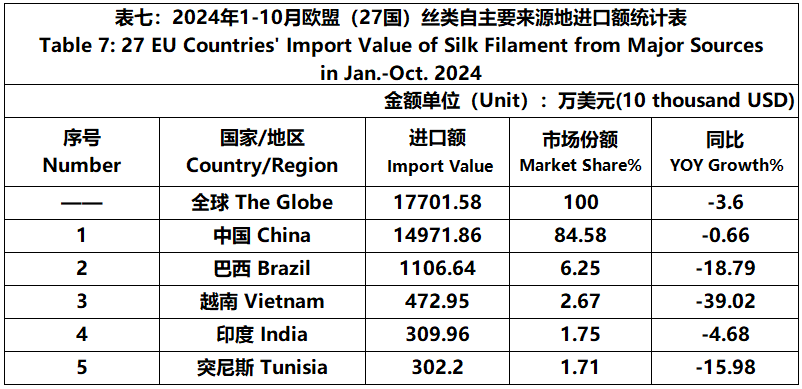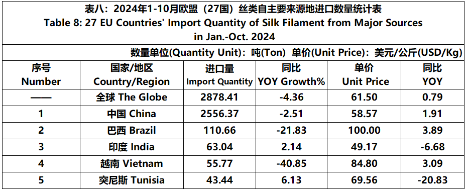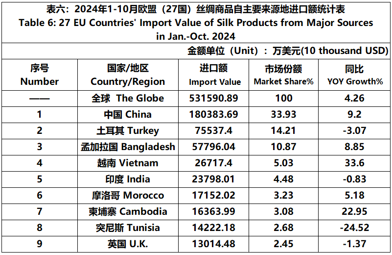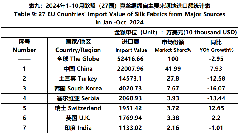 According to Eurostat data, from January to October, the foreign trade value of the EU (27 countries) silk products was 9511 million US dollars, a year-on-year decrease of 1.56%. Among them, the import value was 5316 million US dollars, a year-on-year increase of 4.26%.