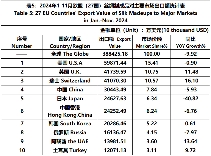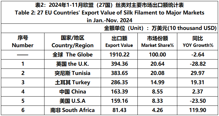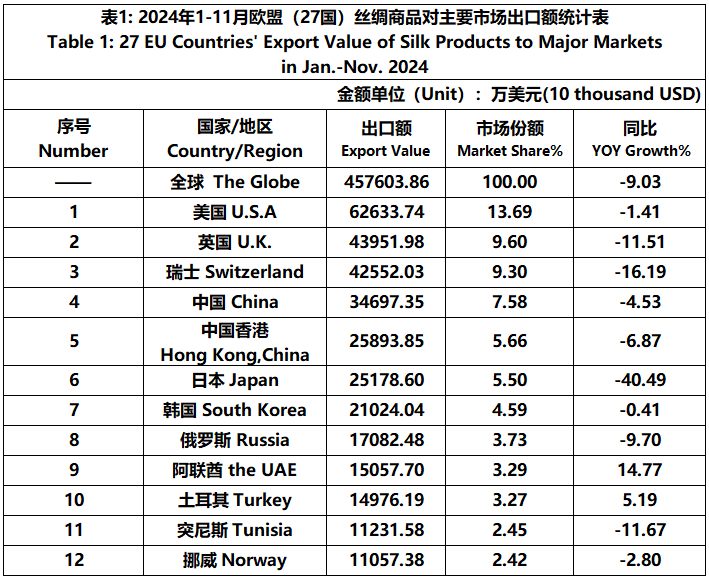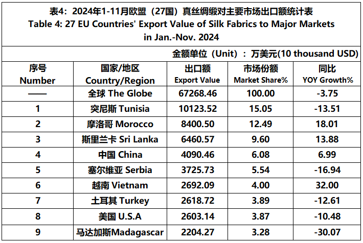 According to Eurostat data, from January to November, the foreign trade value of the EU (27 countries) silk products was 10281 million US dollars, a year-on-year decrease of 2.24%. Among them, the import value was 5705 million US dollars, a year-on-year increase of 4%.