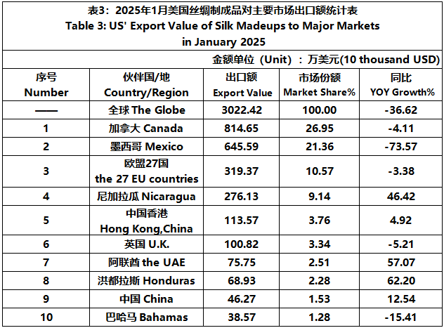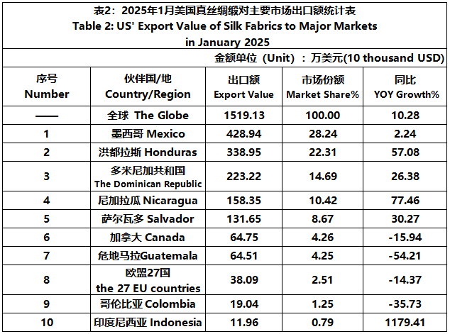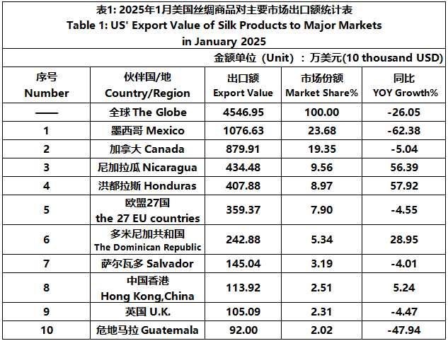 According to the United States Department of Commerce, in January 2025, the foreign trade value of U.S. silk products was $534 million, up 9.57% year-on-year. Among them, the export value was $45.4695 million, a year-on-year decrease of 26.05%.