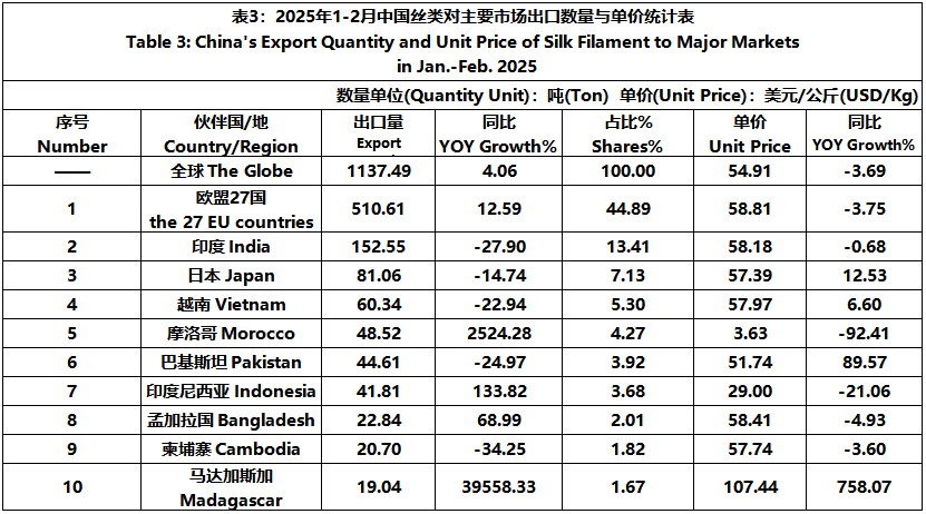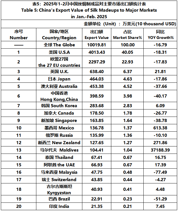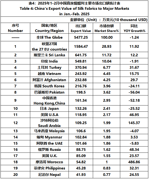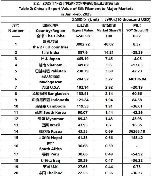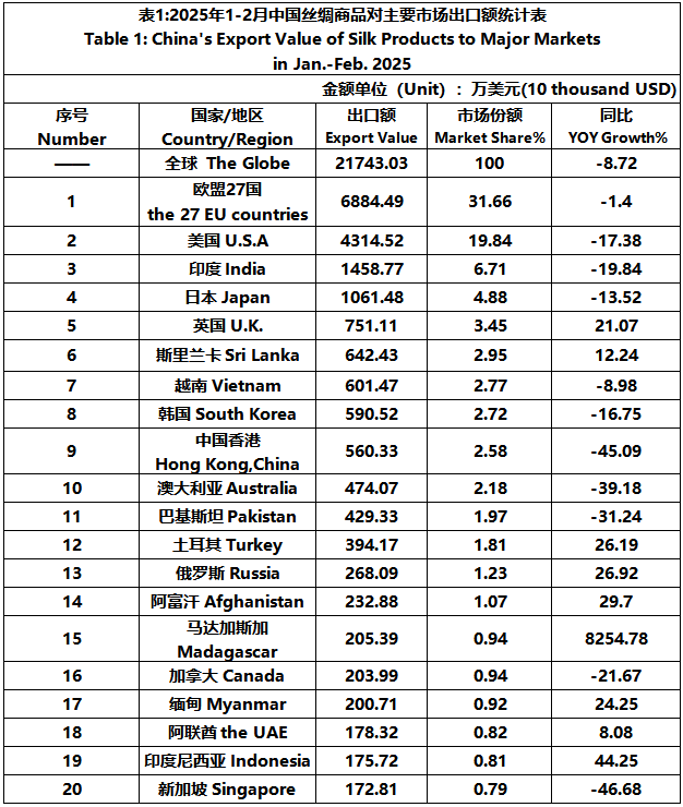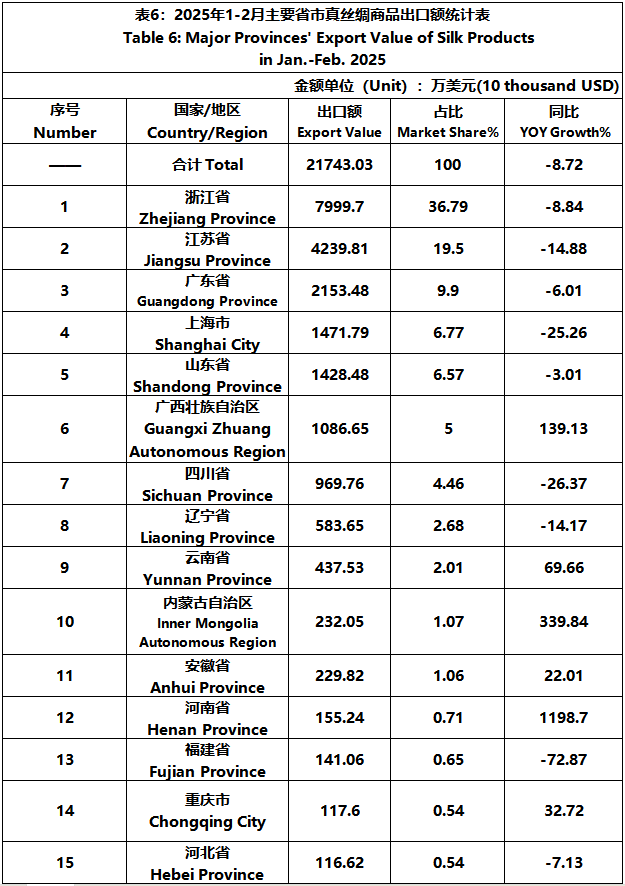 According to the statistics of China Customs, from January to February, the total import and export value of pure silk products was 259 million US dollars, a year-on-year decrease of 12.26%, accounting for 0.56% of China's total textile and apparel imports and exports. Among them, the export value amounted to 217 million US dollars, experiencing a year-on-year decline of 8.72% and accounting for 0.51% of China's textile and apparel exports.