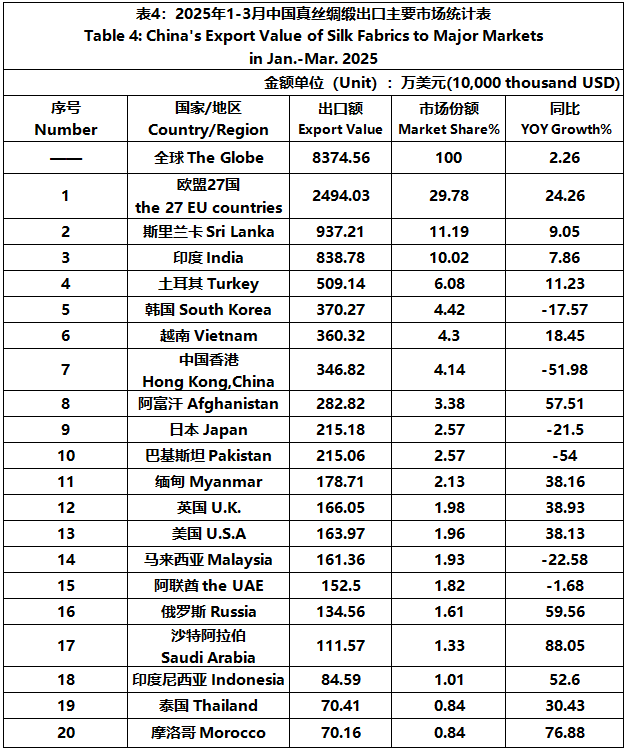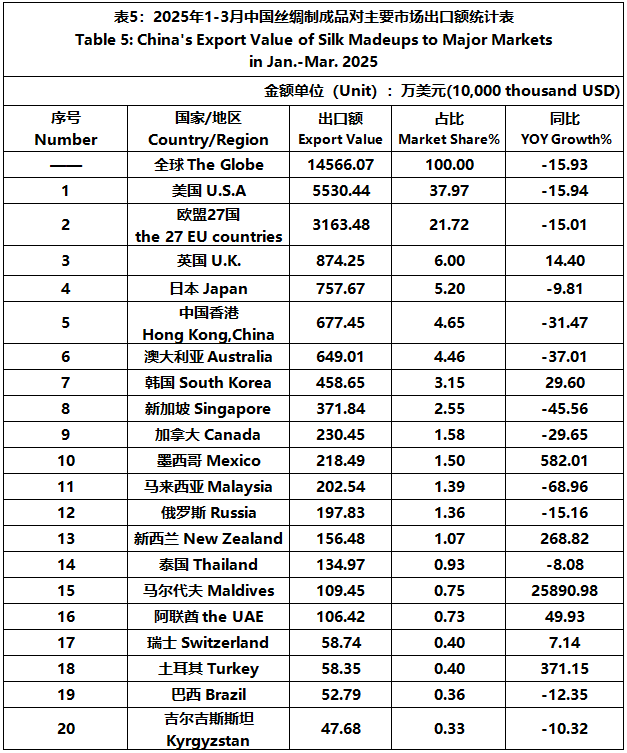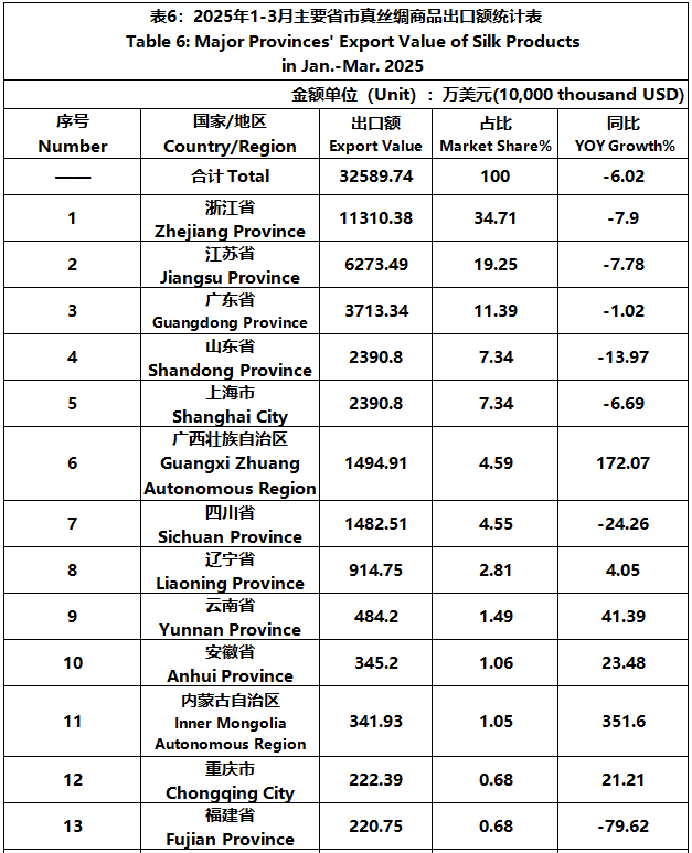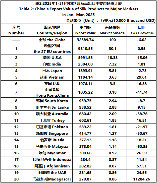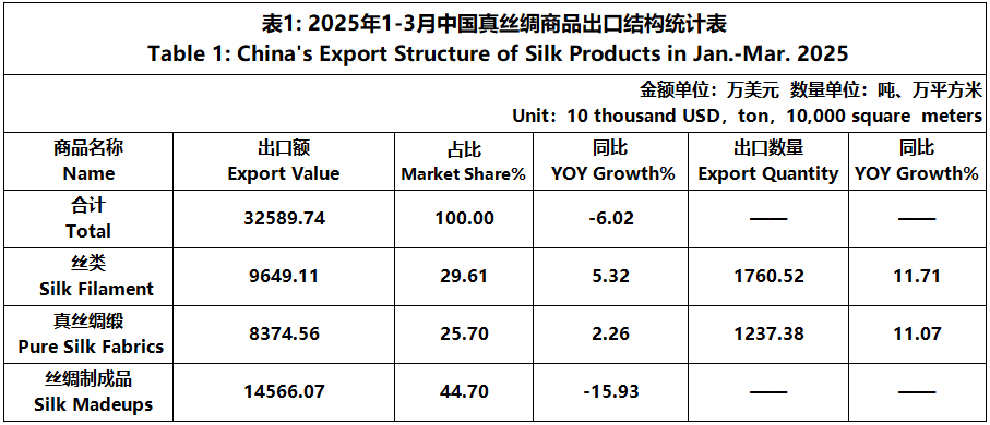 According to the statistics of China Customs, from January to March, the total import and export value of pure silk products was 394 million US dollars, a year-on-year decrease of 9.96%, accounting for 0.56% of China's total textile and apparel imports and exports. Among them, the export value was 326 million US dollars, a year-on-year decrease of 6.02%, accounting for 0.52% of China's textile and apparel exports, which increased by 0.97% year-on-year during the same period.
