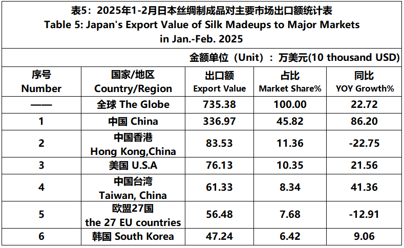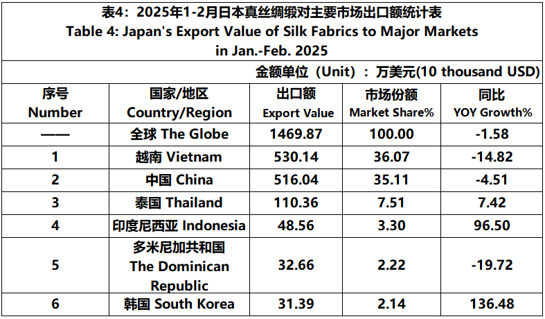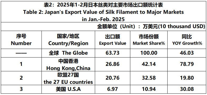 According to JCCI, from January to February 2025, the total foreign trade value of pure silk products was 319 million US dollars, a year-on-year increase of 12.86%. Among them, the export value was 22.6899 million US dollars, a year-on-year increase of 6.21%.