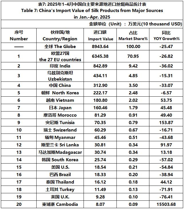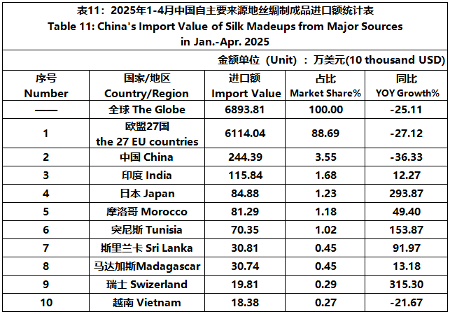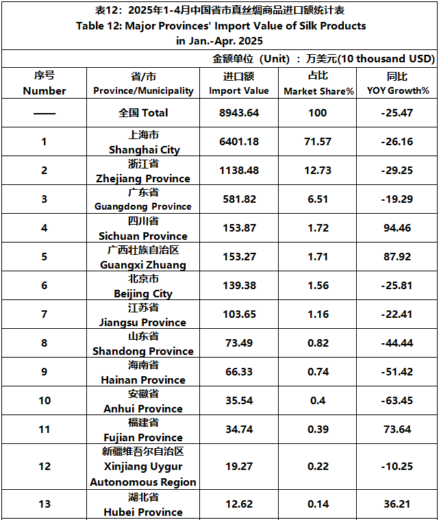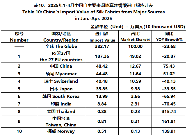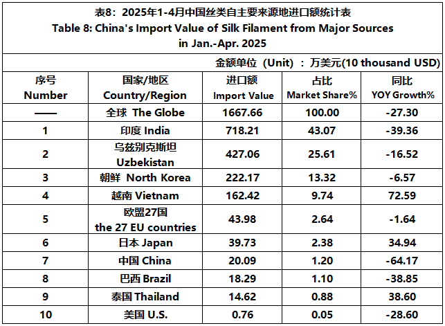 According to the statistics of China Customs, from January to April, the total import and export value of pure silk products was 522 million US dollars, a year-on-year decrease of 10%, accounting for 0.54% of China's total textile and apparel imports and exports. Among them, the import value was 89.4364 million US dollars, a year-on-year decrease of 25.47%, accounting for 1.44% of China's textile and apparel imports.