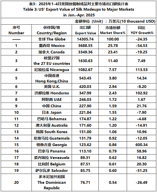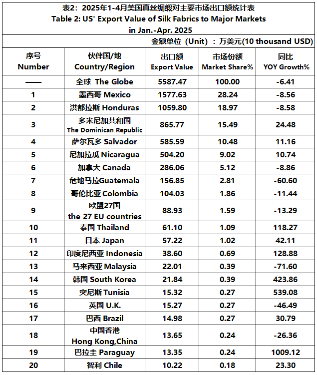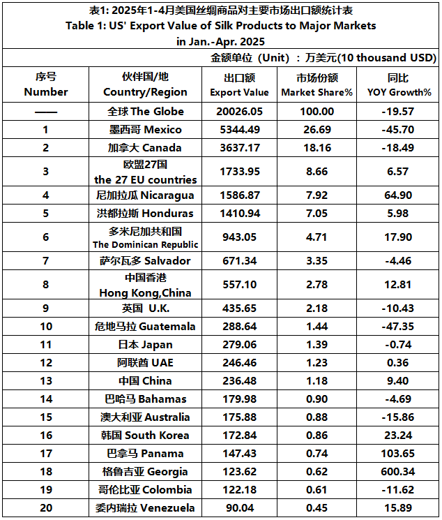 According to the United States Department of Commerce, from January to April 2025, the foreign trade value of U.S. silk products was $2045 million, down 1.81% year-on-year. Among them, the export value was $200 million, a year-on-year decrease of 19.57%.