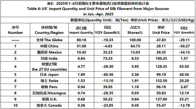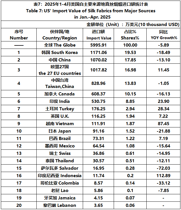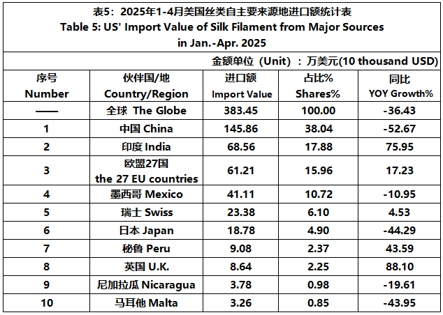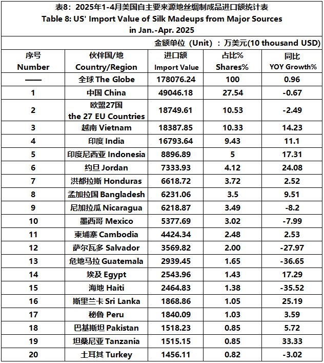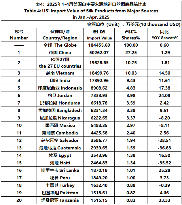 According to the United States Department of Commerce, from January to April 2025, the foreign trade value of U.S. silk products was $2045 million, down 1.81% year-on-year. Among them, the import value was $1845 million, a year-on-year increase of 0.60%.