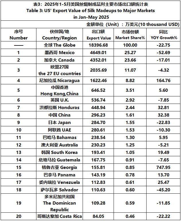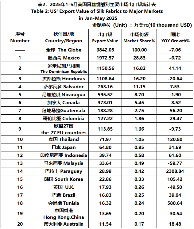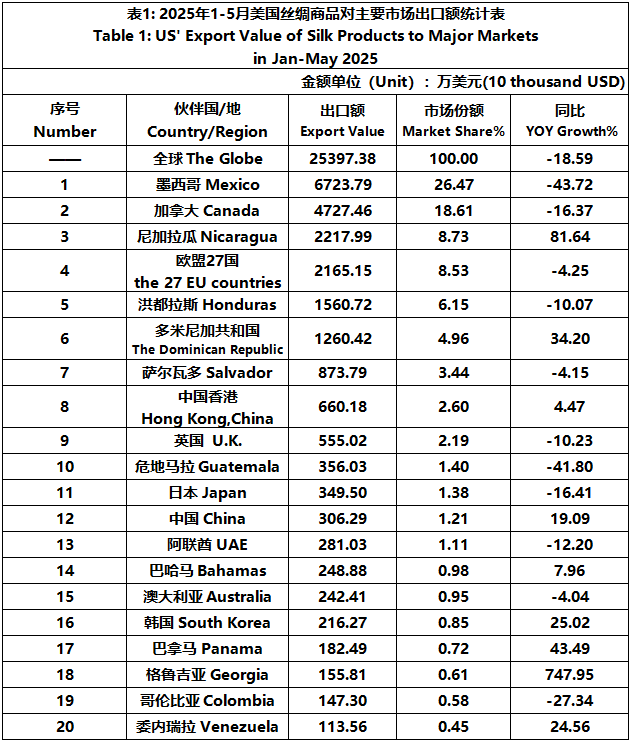 According to the United States Department of Commerce, from January to May 2025, the foreign trade value of U.S. silk products was $2457 million, down 4.59% year-on-year. Among them, the export value was $254 million, a year-on-year decrease of 18.59%.