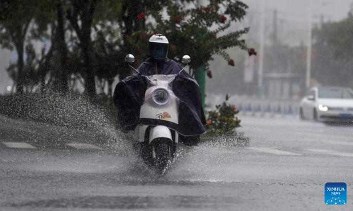 A citizen rides amid heavy rainfall in Beihai, South China's Guangxi Zhuang Autonomous Region on June 14, 2025. Multiple Chinese authorities convened on Saturday to put in place precautionary measures against Typhoon Wutip, the first typhoon of the year, which is expected to bring heavy rainfall to the southern parts of the country.