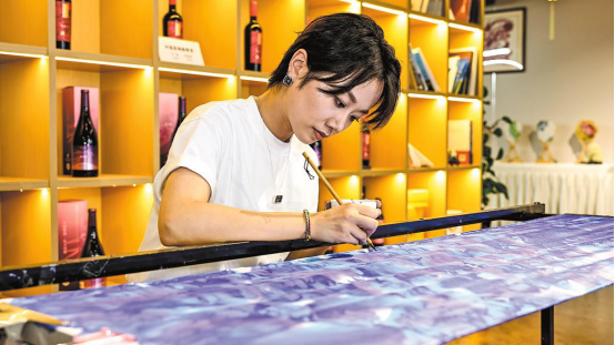 In a workshop with a faint scent of dyes lingering in the air, Yu Xinxin holds a brush in hand, leaning forward slightly to add the final strokes to a painting on a piece of silk.