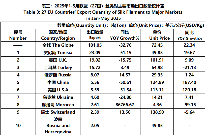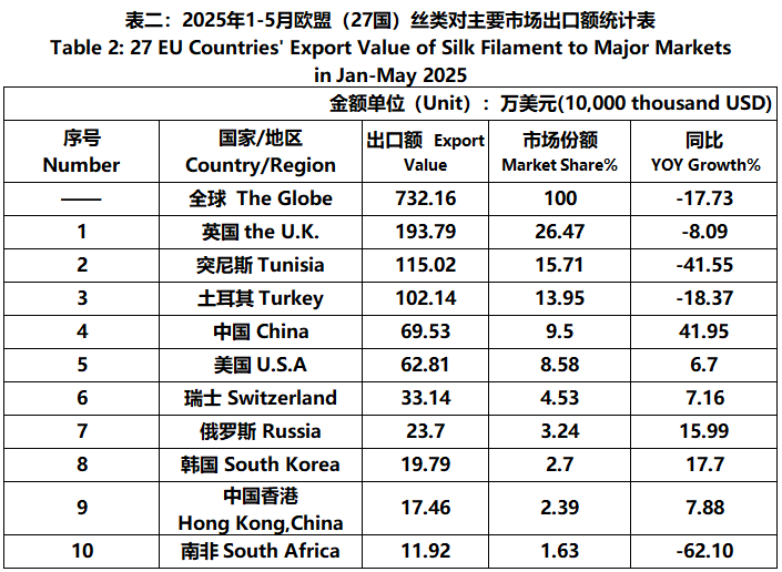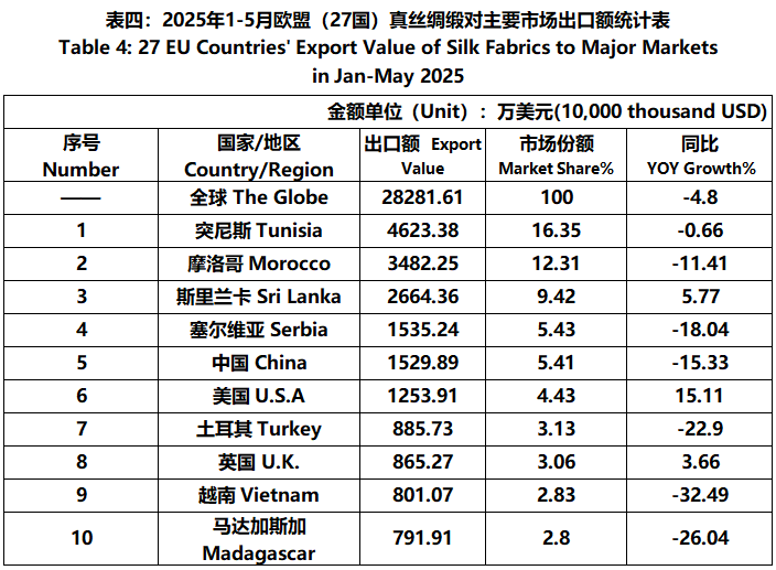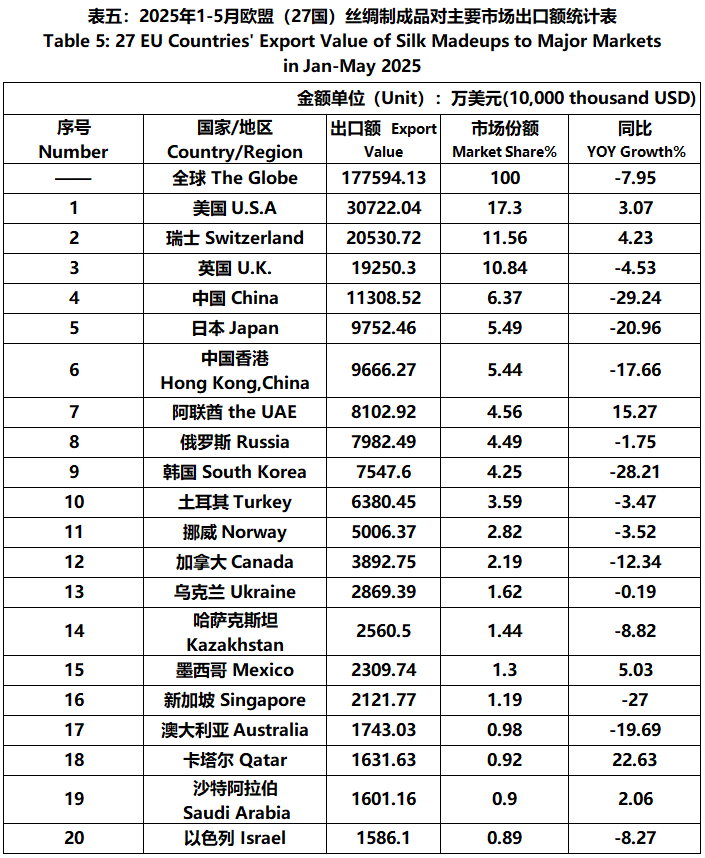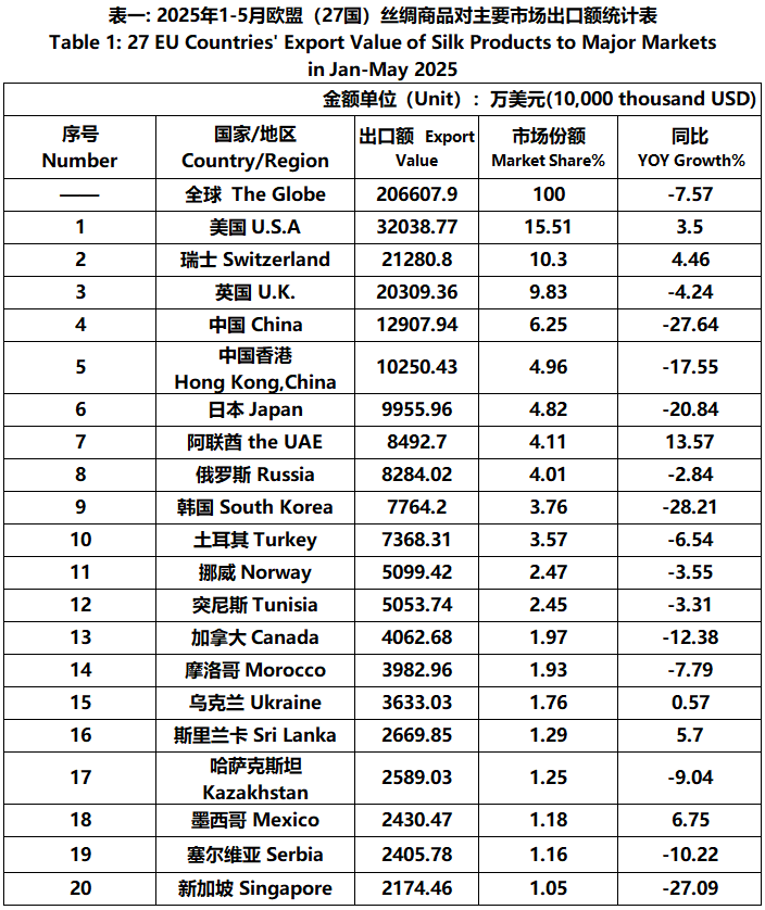 According to Eurostat data, from January to May, the foreign trade value of EU (27 countries) silk products was 5.046 billion US dollars, a year-on-year increase of 0.68%. Among them, the export value was 2066 million US dollars, a year-on-year decrease of 7.57%.