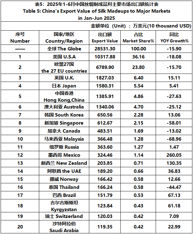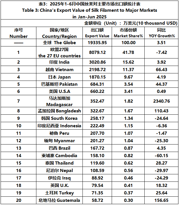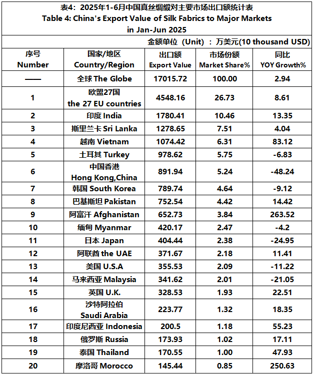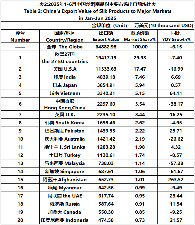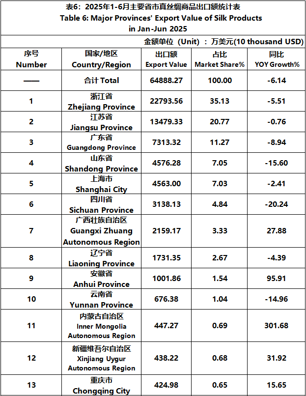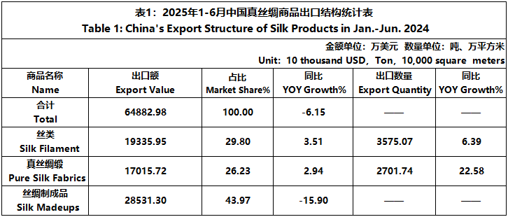 According to the statistics of China Customs, from January to June, the total import and export value of pure silk products was 786 million US dollars, a year-on-year decrease of 9.72%, accounting for 0.51% of China's total textile and apparel imports and exports. Among them, the export value was 649 million US dollars, a year-on-year decrease of 6.15%, accounting for 0.45% of China's textile and apparel exports.