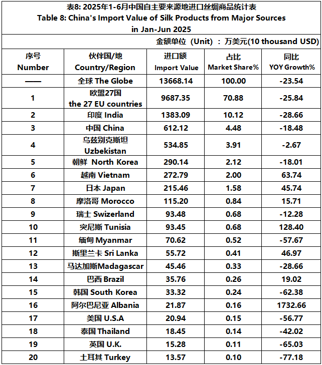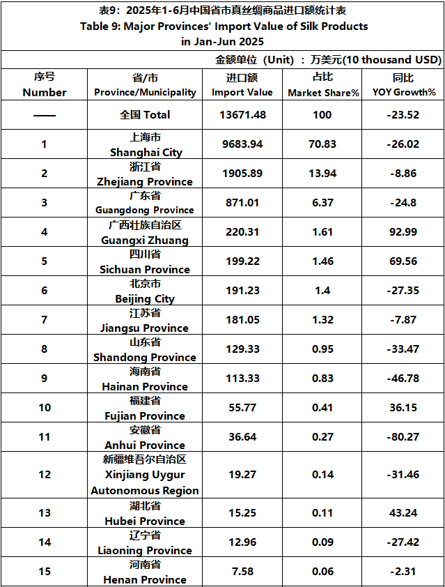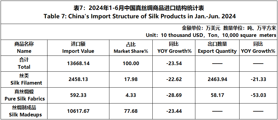 According to the statistics of China Customs, from January to June, the total import and export value of pure silk products was 786 million US dollars, a year-on-year decrease of 9.72%, accounting for 0.51% of China's total textile and apparel imports and exports. Among them, the import value was 137 million US dollars, a year-on-year decrease of 23.54%, accounting for 1.48% of China's textile and apparel imports.