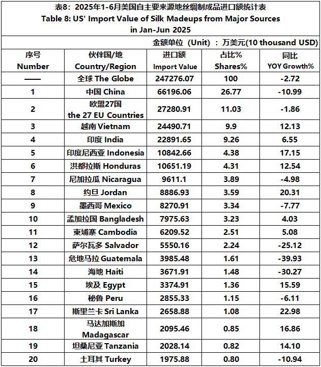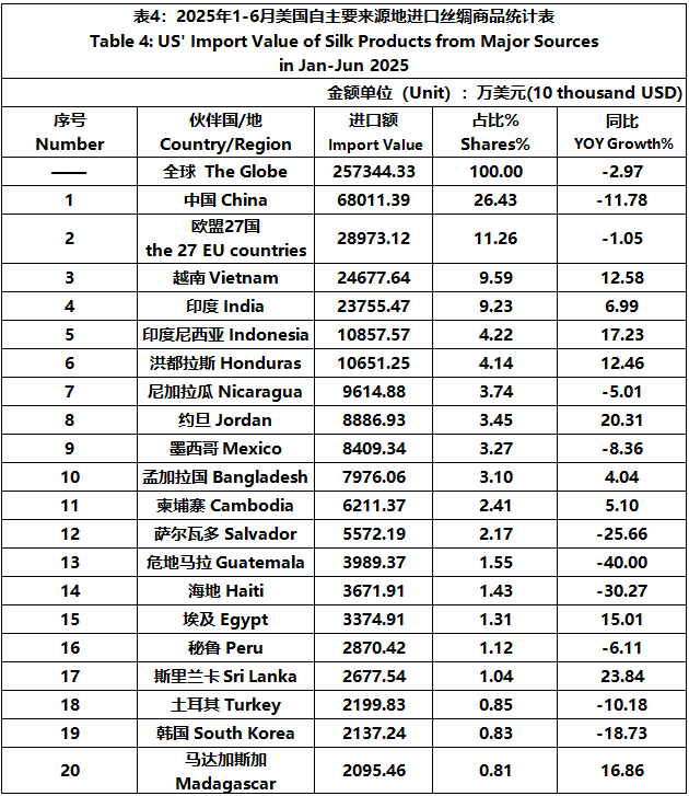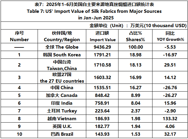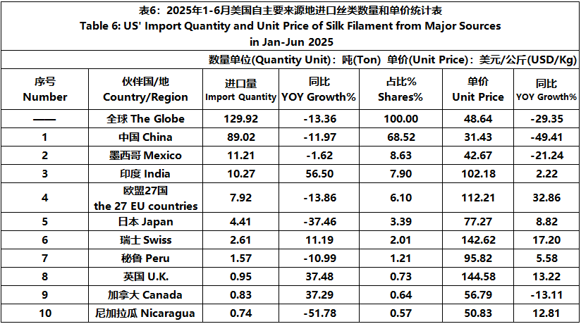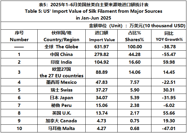 According to the United States Department of Commerce, from January to June 2025, the foreign trade value of U.S. silk products was $2876 million, down 4.55% year-on-year. Among them, the import value was $2573 million, a year-on-year decrease of 2.97%.