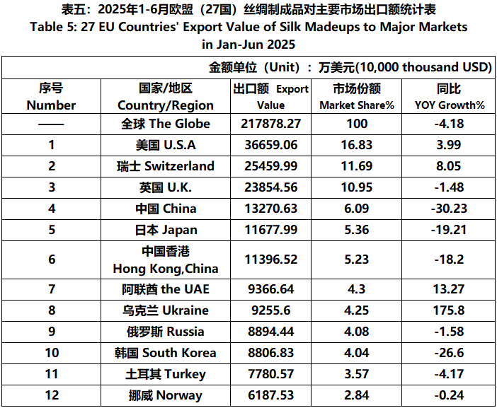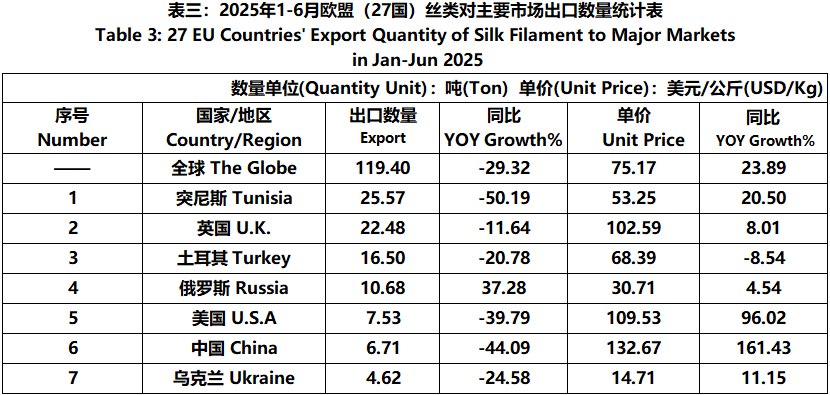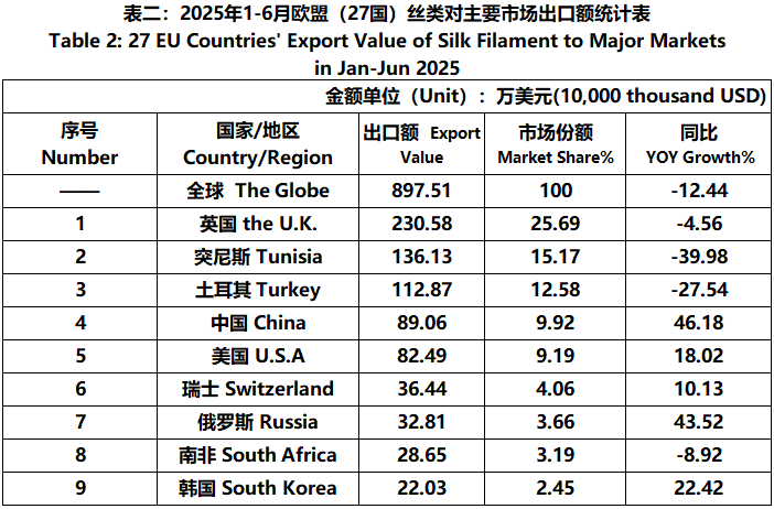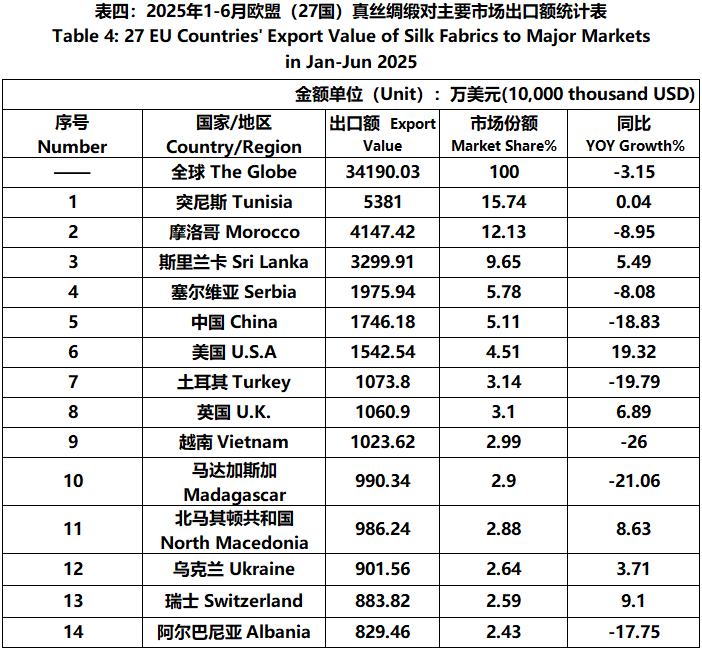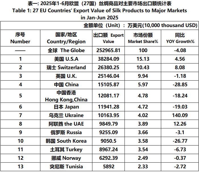 According to Eurostat data, from January to June, the foreign trade value of EU (27 countries) silk products was 6.075 billion US dollars, a year-on-year increase of 2.14%. Among them, the export value was 2530 million US dollars, a year-on-year decrease of 4.08%.