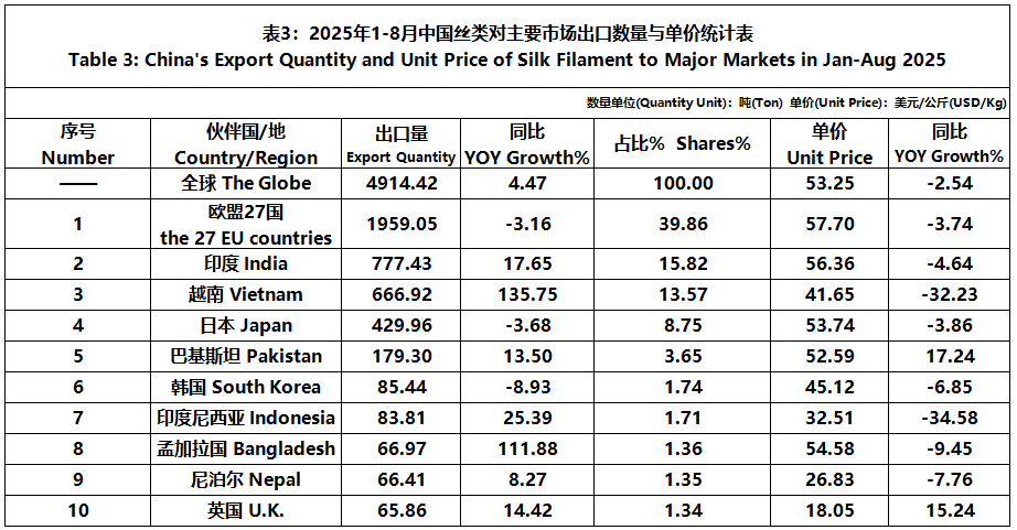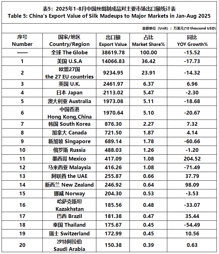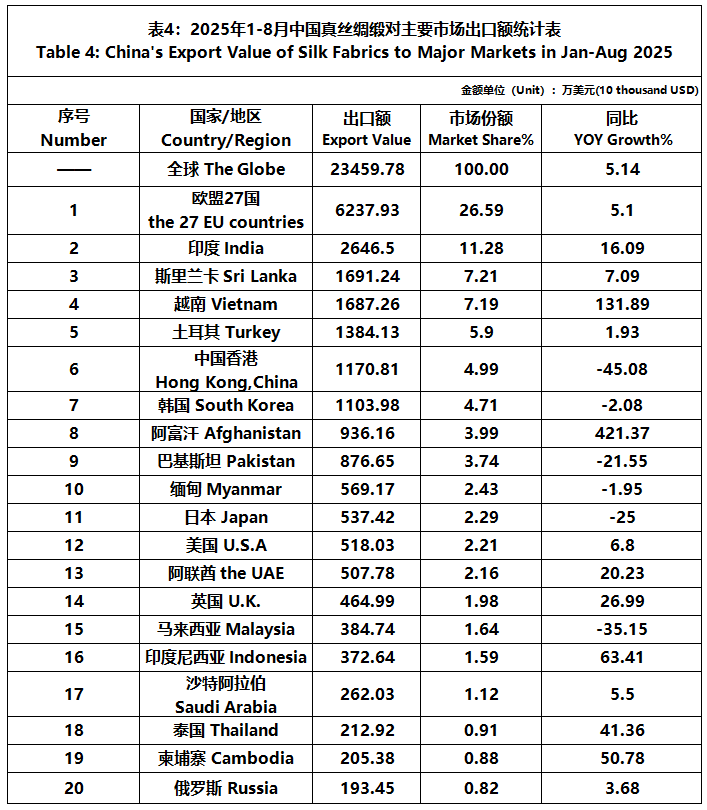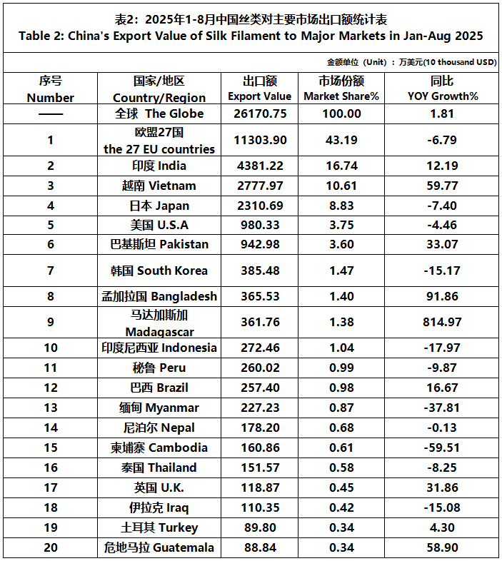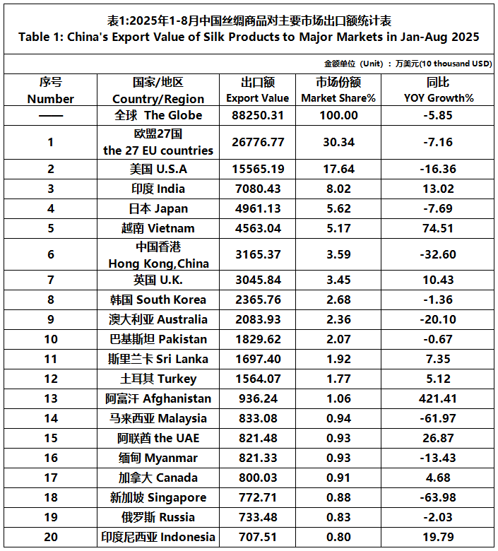 According to the statistics of China Customs, from January to August, the total import and export value of pure silk products was 1075 million US dollars, a year-on-year decrease of 7.58%, accounting for 0.51% of China's total textile and apparel imports and exports. Among them, the export value was 883 million US dollars, a year-on-year decrease of 5.85%, accounting for 0.45% of China's textile and apparel exports.