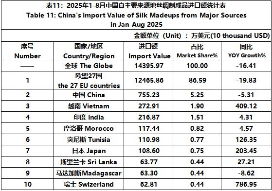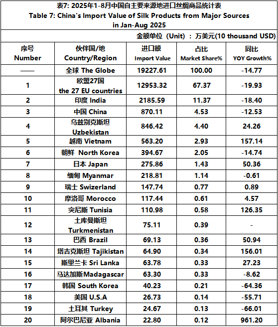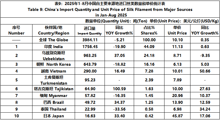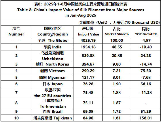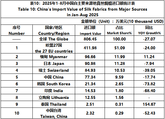 According to the statistics of China Customs, from January to August, the total import and export value of pure silk products was 1075 million US dollars, a year-on-year decrease of 7.58%, accounting for 0.51% of China's total textile and apparel imports and exports. Among them, the import value was 192 million US dollars, a year-on-year decrease of 14.77%, accounting for 1.50% of China's textile and apparel imports.