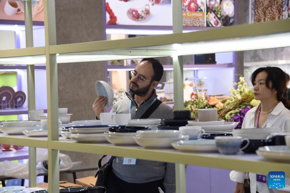 People view porcelain tableware at the second phase of the 138th edition of the Canton Fair in Guangzhou, south China's Guangdong Province, Oct. 27, 2025. The second phase of the 138th edition of the Canton Fair, showcasing household goods, gifts, decorations, building materials, and furniture, closed here on Monday.