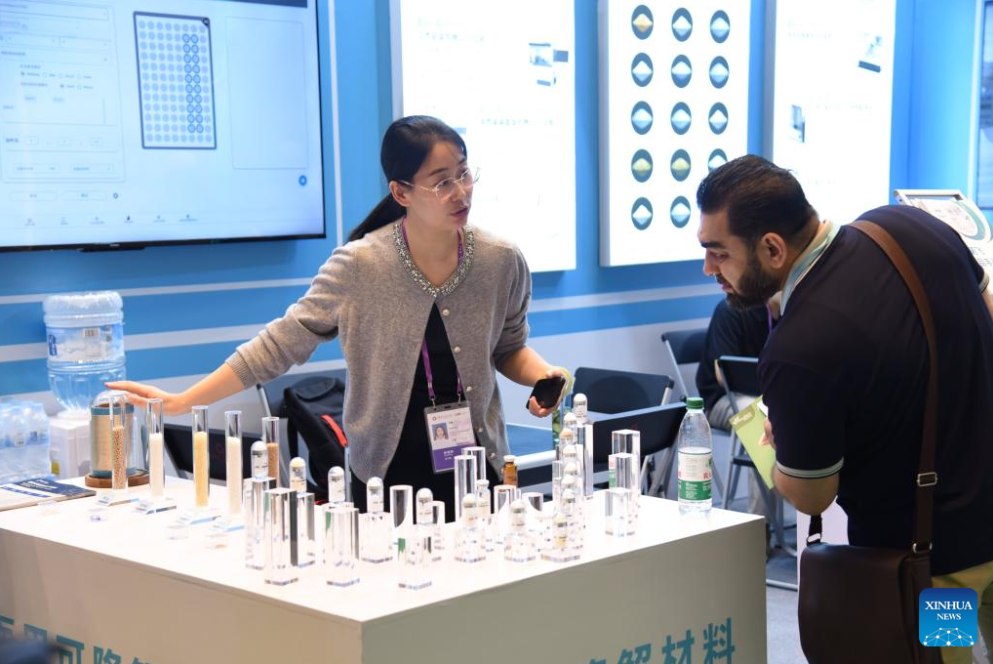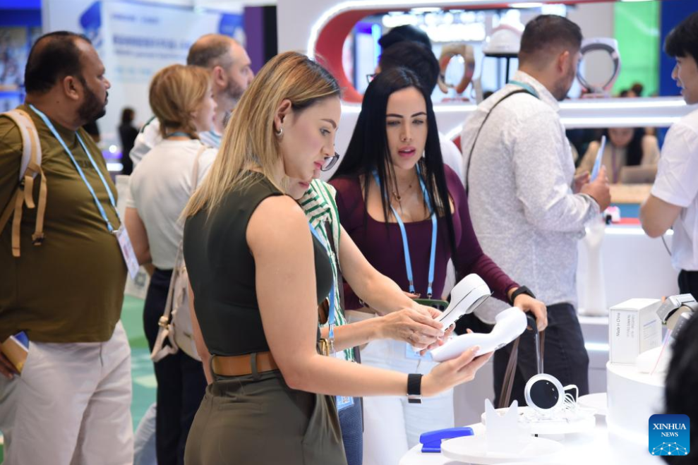 Visitors view exhibits at the Intelligent Healthcare exhibition area of the 138th edition of the Canton Fair in Guangzhou, south China's Guangdong Province, Oct. 31, 2025.