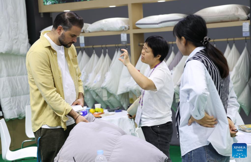 A visitor views home textile products at the 138th edition of the Canton Fair in Guangzhou, south China's Guangdong Province, Oct. 31, 2025.