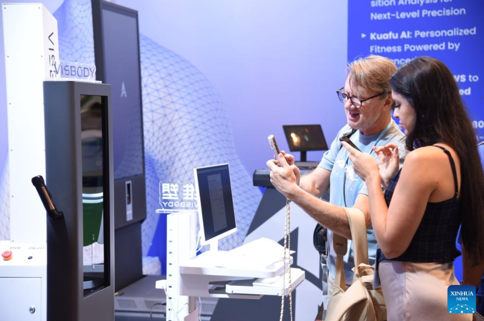 A visitor tries an exhibit at the Intelligent Healthcare exhibition area of the 138th edition of the Canton Fair in Guangzhou, south China's Guangdong Province, Oct. 31, 2025.