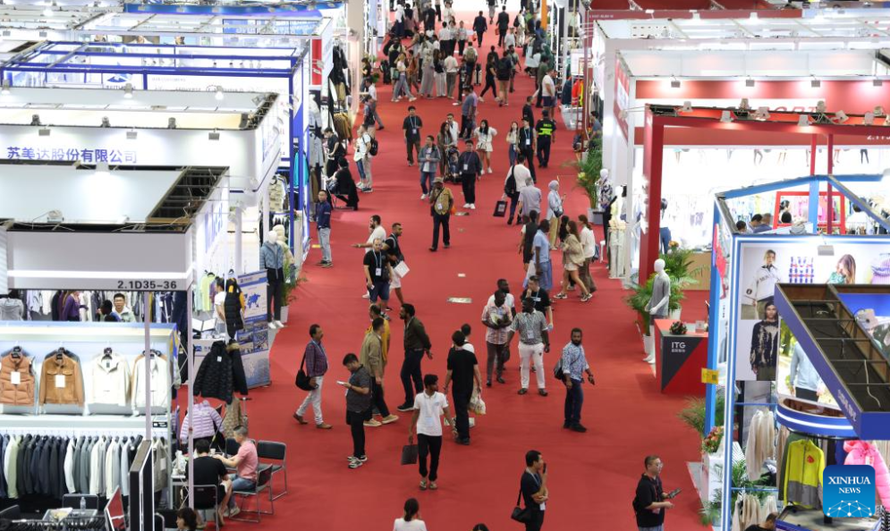 A visitor views clothes at the 138th edition of the Canton Fair in Guangzhou, south China's Guangdong Province, Oct. 31, 2025.