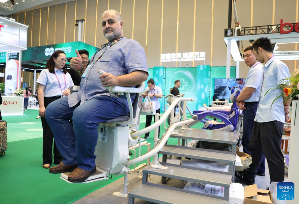 A visitor tries a stairlift at the Intelligent Healthcare exhibition area of the 138th edition of the Canton Fair in Guangzhou, south China's Guangdong Province, Oct. 31, 2025.