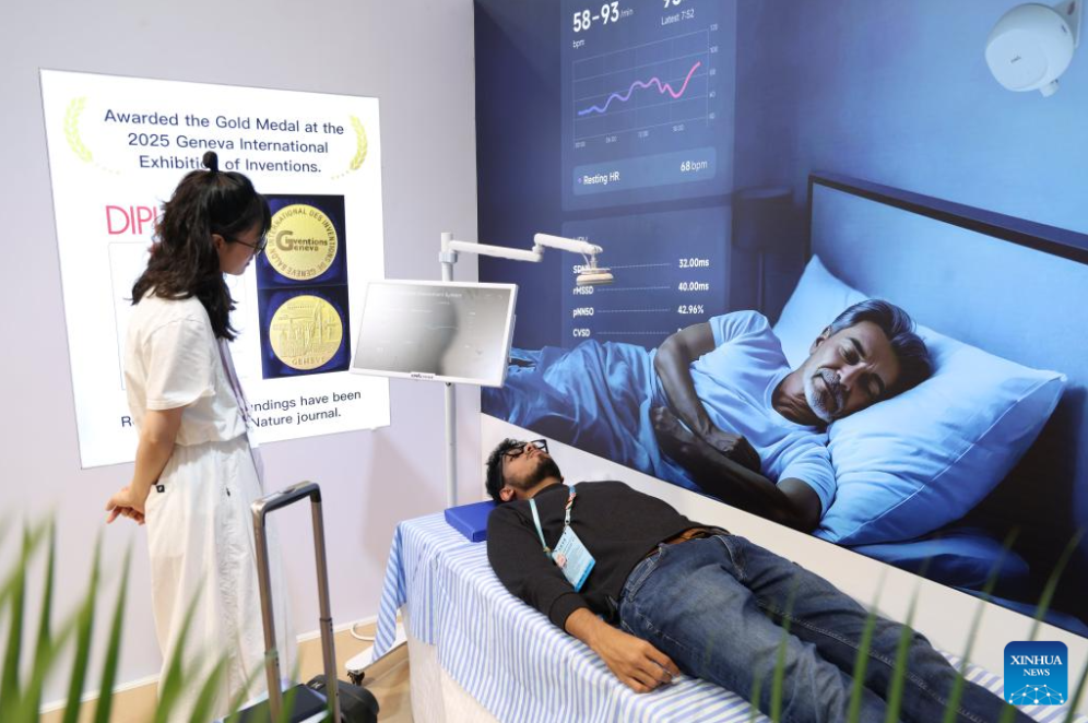 A visitor tries a non-contact cardiac health monitoring system at the Intelligent Healthcare exhibition area of the 138th edition of the Canton Fair in Guangzhou, south China's Guangdong Province, Oct. 31, 2025.