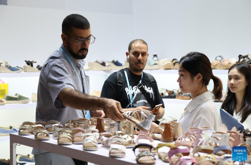 A visitor views shoes at the 138th edition of the Canton Fair in Guangzhou, south China's Guangdong Province, Oct. 31, 2025.