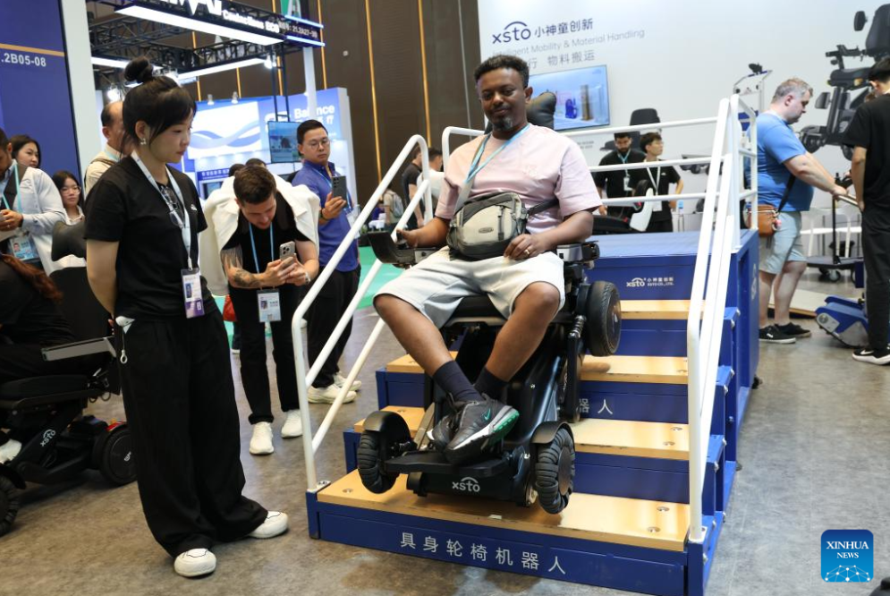 A visitor tries a wheelchair robot at the Intelligent Healthcare exhibition area of the 138th edition of the Canton Fair in Guangzhou, south China's Guangdong Province, Oct. 31, 2025.