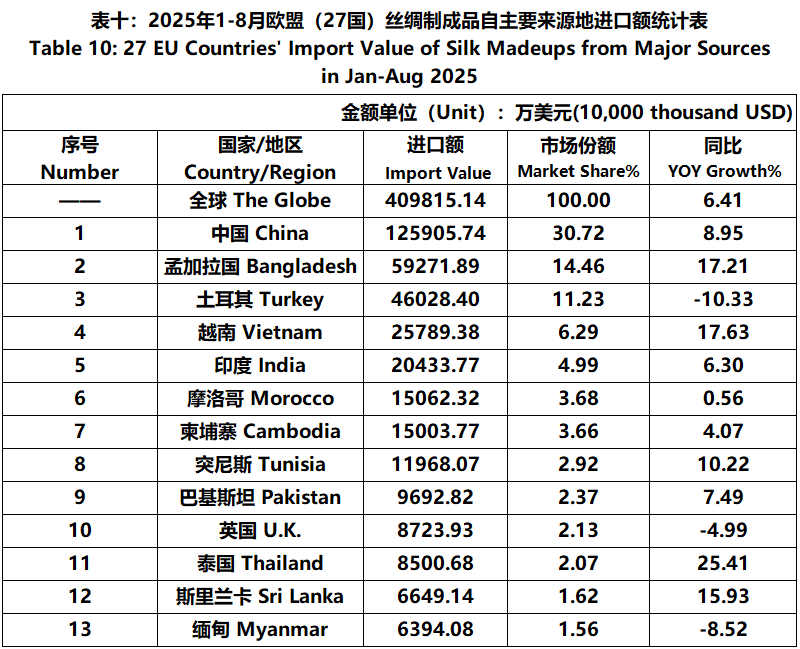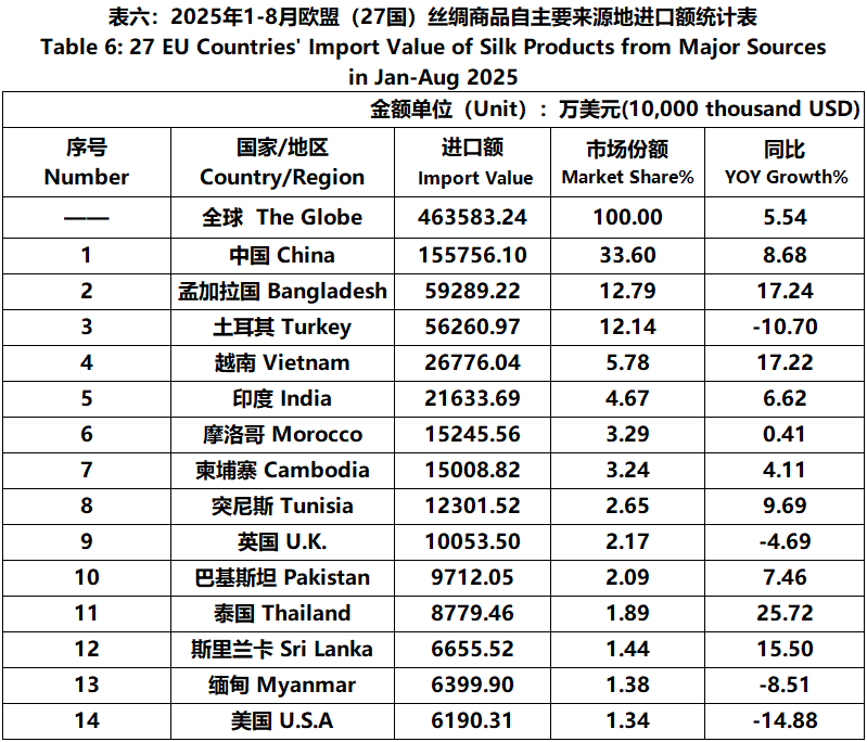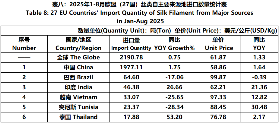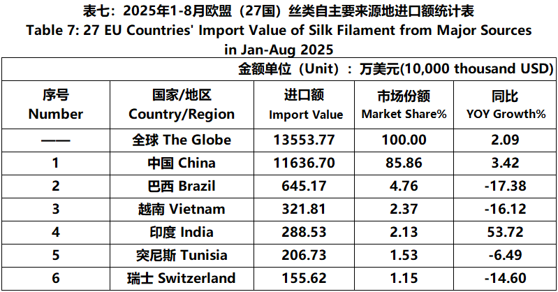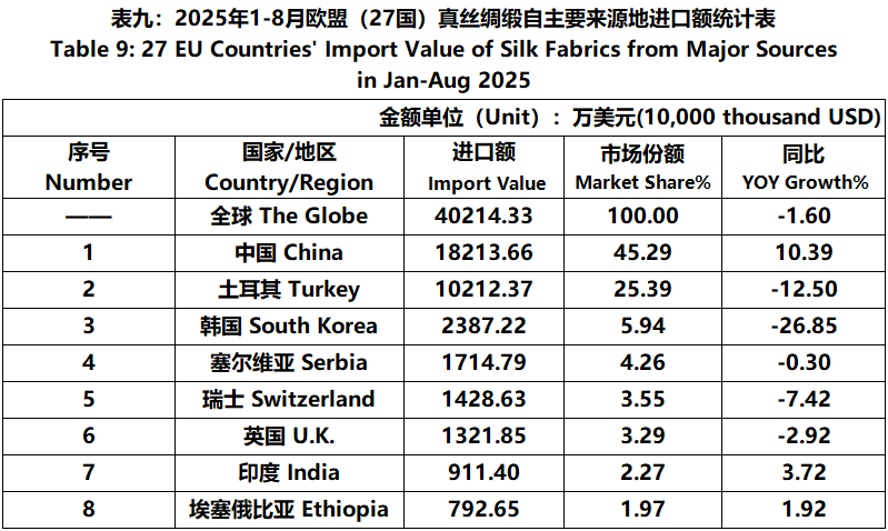 According to Eurostat data, from January to August, the foreign trade value of EU (27 countries) silk products was 7.931 billion US dollars, a year-on-year increase of 1.65%. Among them, the import value was 4636 million US dollars, a year-on-year increase of 5.54%.