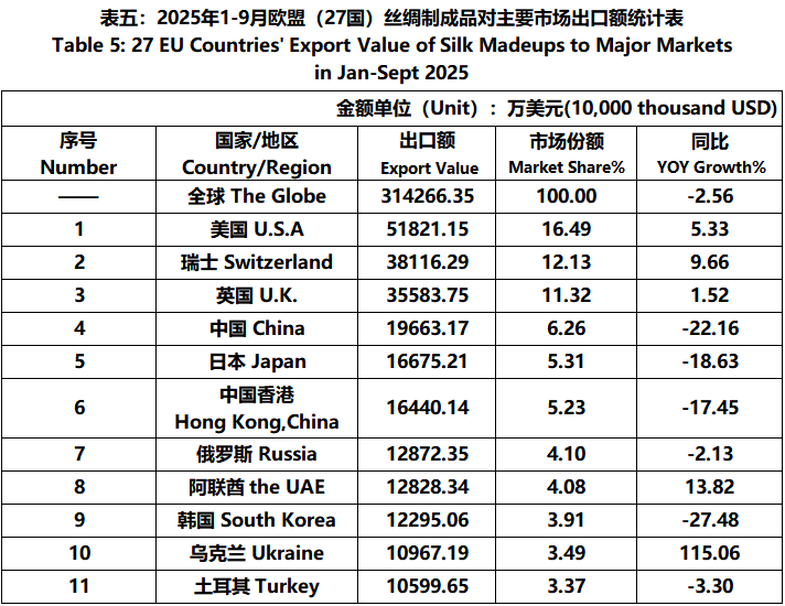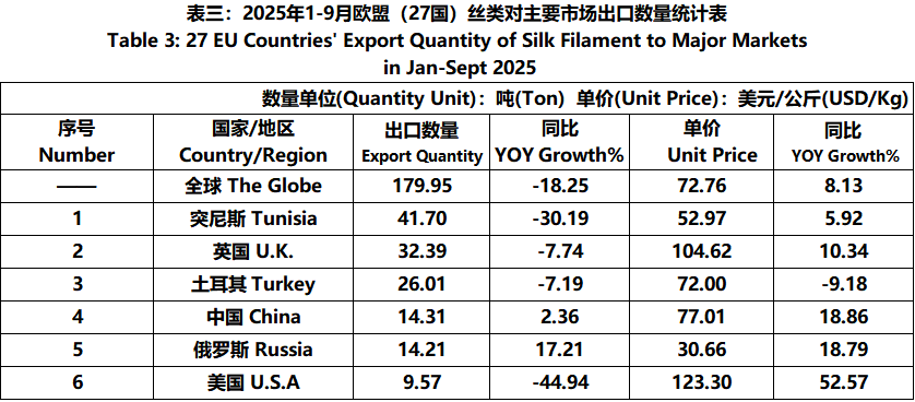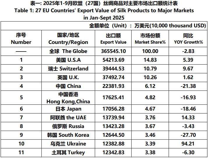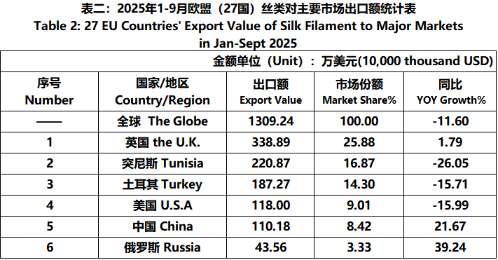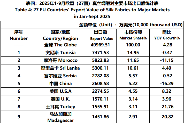 According to Eurostat data, from January to September, the foreign trade value of EU (27 countries) silk products was 7.931 billion US dollars, a year-on-year increase of 1.65%. Among them, the export value was 3295 million US dollars, a year-on-year decrease of 3.36%.