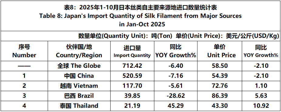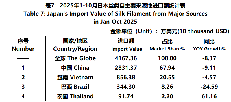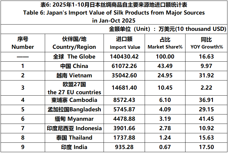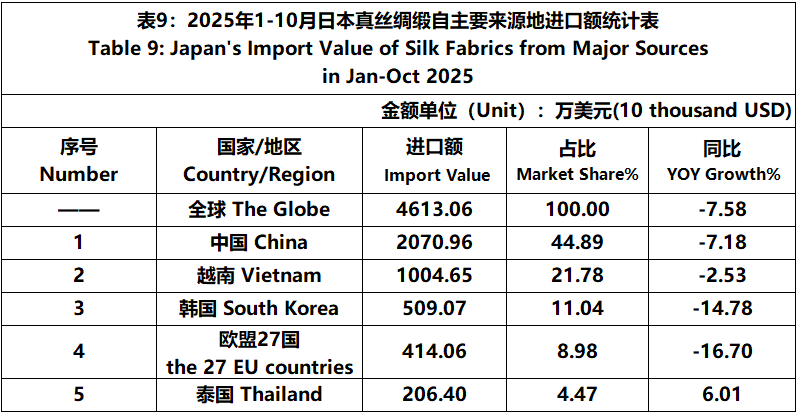 According to JCCI, from January to October 2025, the total foreign trade value of pure silk products was 1530 million US dollars, a year-on-year increase of 14.93%. Among them, the export value was 126 million US dollars, a year-on-year decrease of 1.17%.