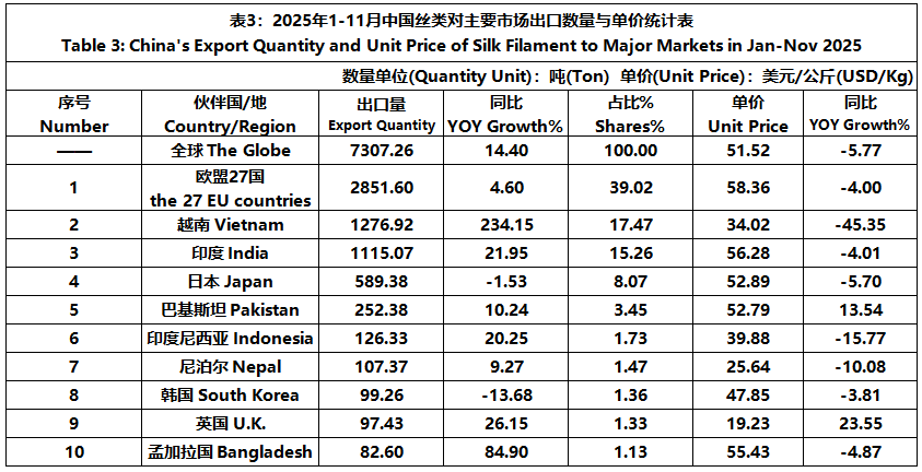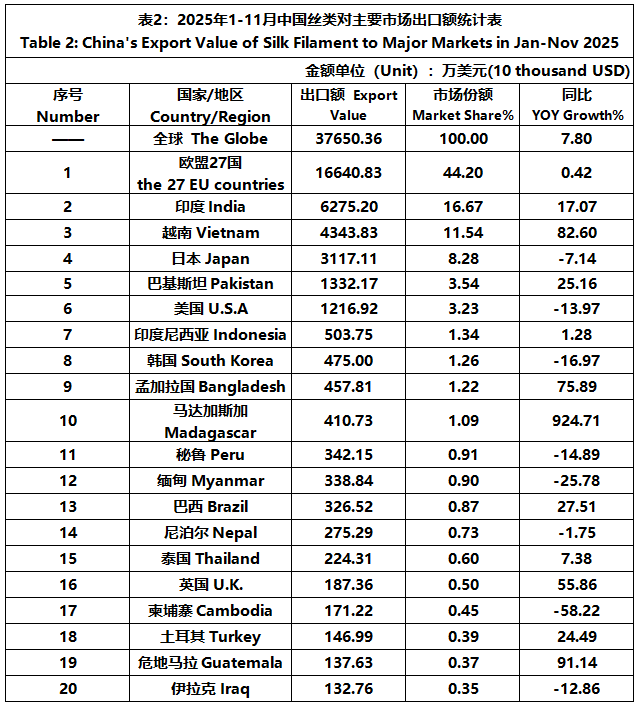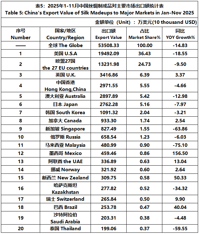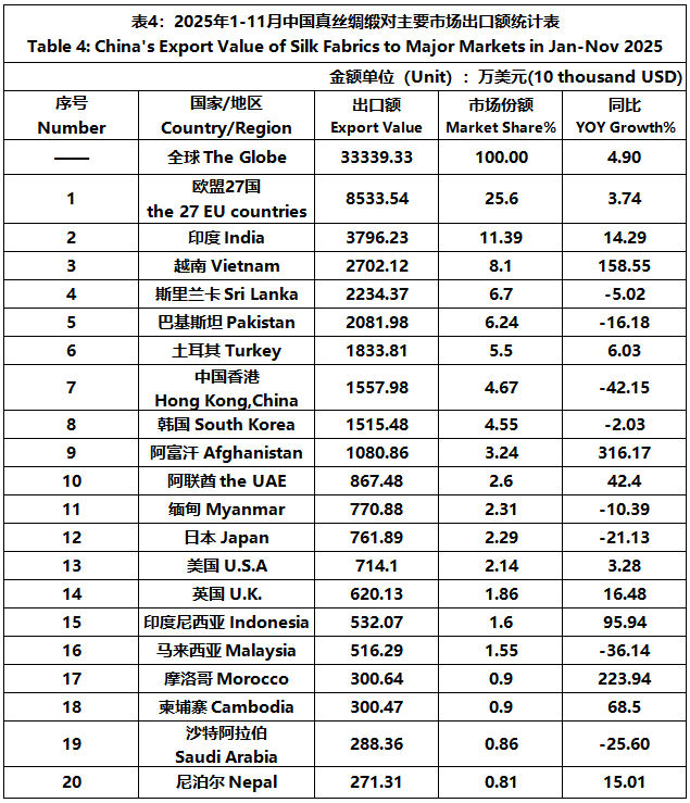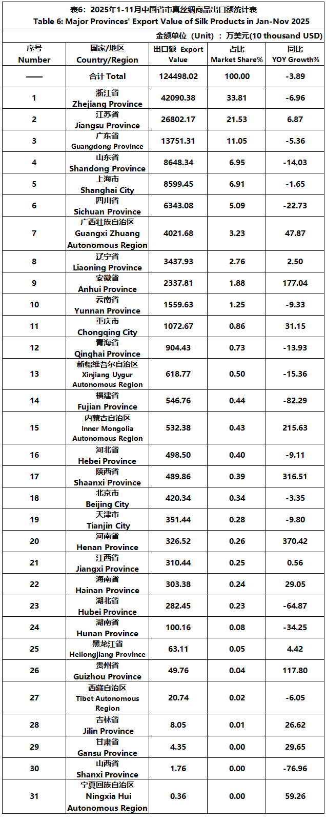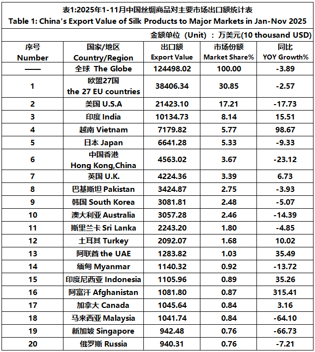 According to the statistics of China Customs, from January to November, the total import and export value of pure silk products was 1506 million US dollars, a year-on-year decrease of 5.29%, accounting for 0.53% of China's total textile and apparel imports and exports. Among them, the export value was 1245 million US dollars, a year-on-year decrease of 3.89%, accounting for 0.46% of China's textile and apparel exports.