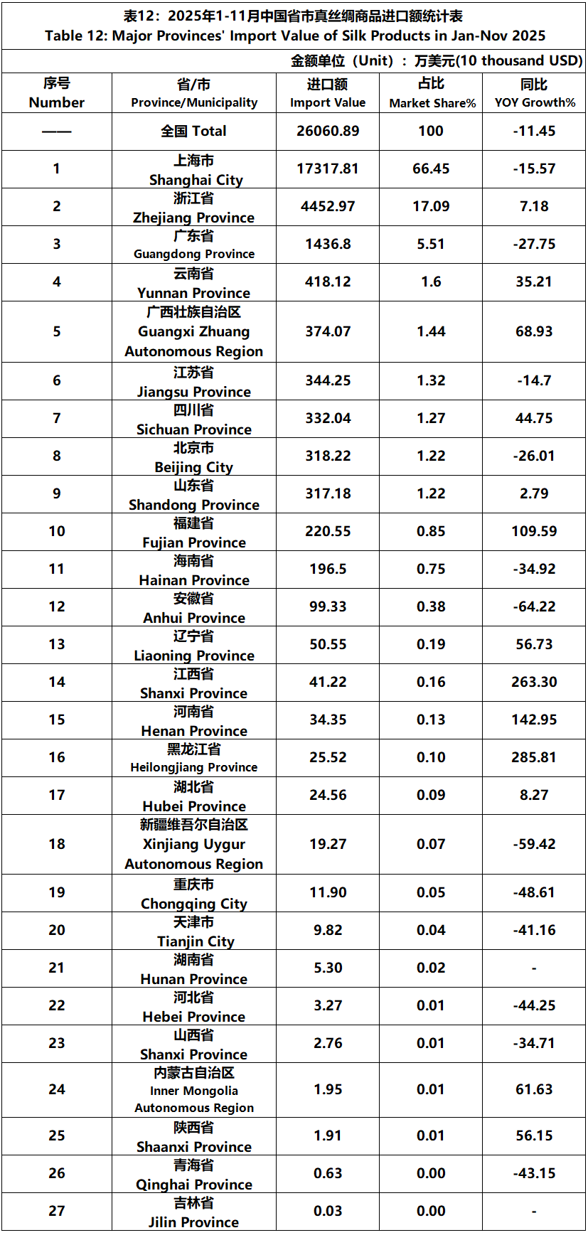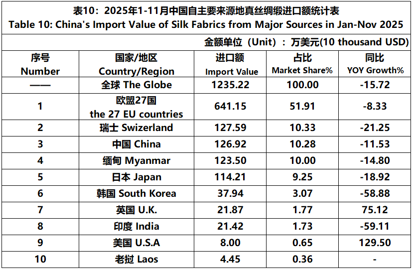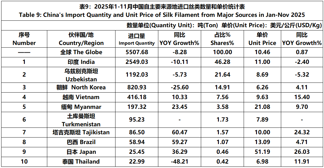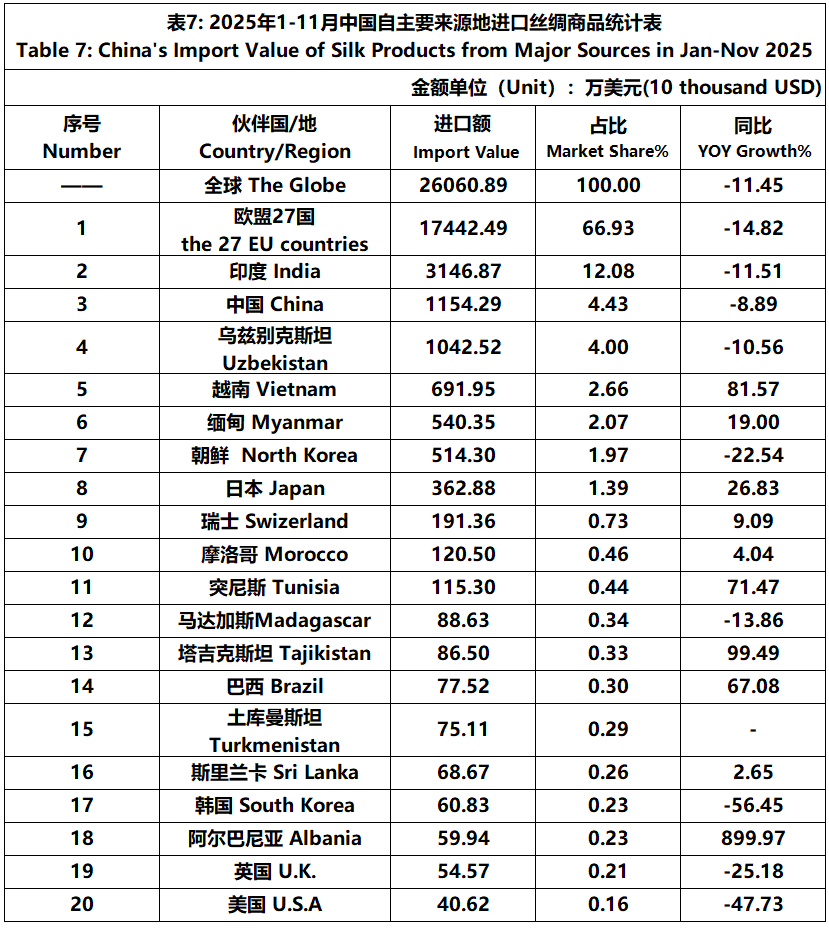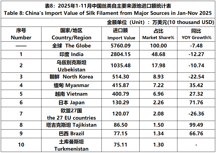 According to the statistics of China Customs, from January to November, the total import and export value of pure silk products was 1506 million US dollars, a year-on-year decrease of 5.29%, accounting for 0.53% of China's total textile and apparel imports and exports. Among them, the import value was 192 million US dollars, a year-on-year decrease of 14.77%, accounting for 1.50% of China's textile and apparel imports.