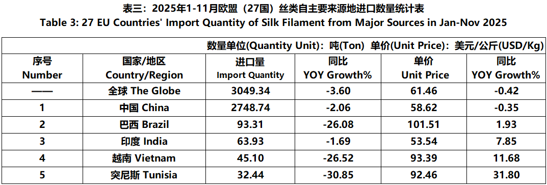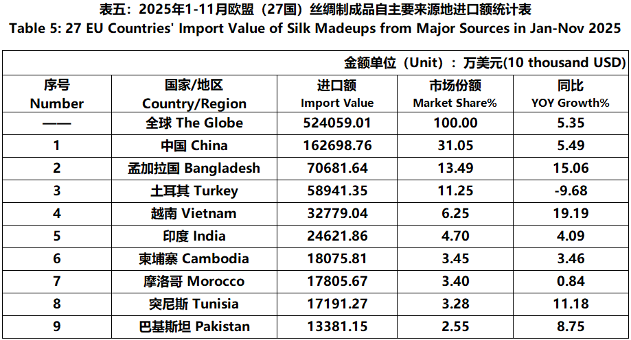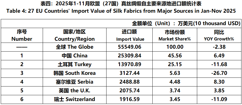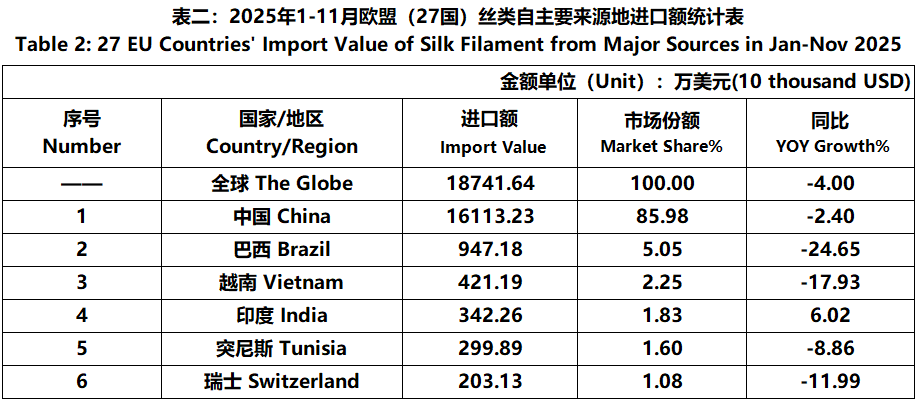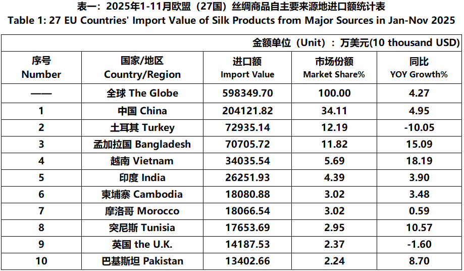 According to Eurostat data, from January to November, the foreign trade value of EU (27 countries) silk products was 10454 million US dollars, a year-on-year increase of 1.37%. Among them, the import value was 5983 million US dollars, a year-on-year increase of 4.27%.