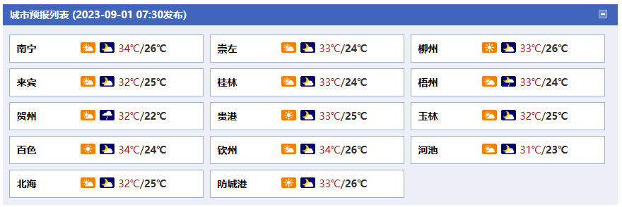 南寧市:今天白天到晚上,多云到晴,東北風(fēng)1~2級,最高氣溫34℃,最低氣溫26℃。