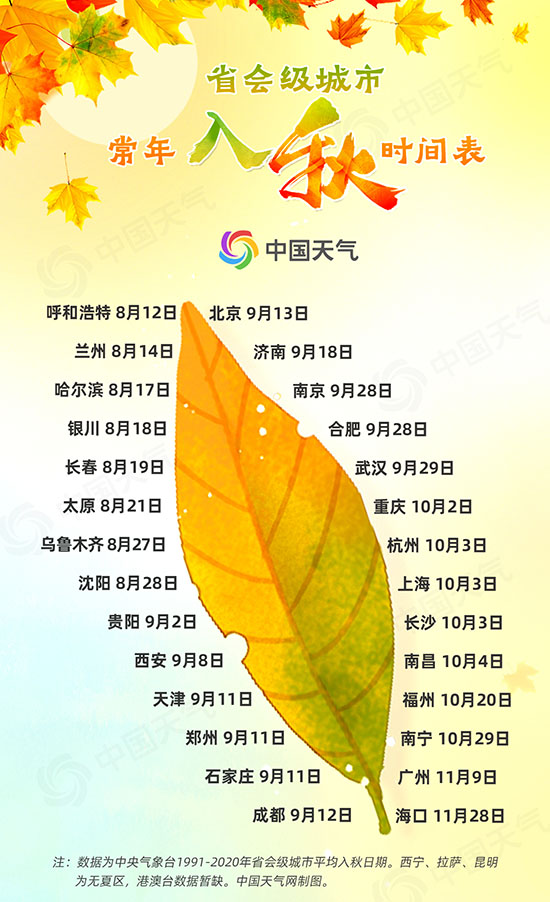 常年省會級城市入秋時間表出爐 9月至10月是全國入秋集中期