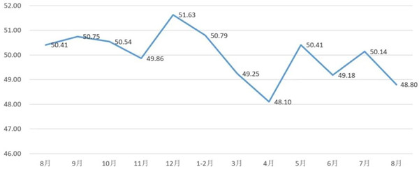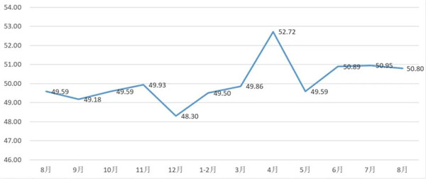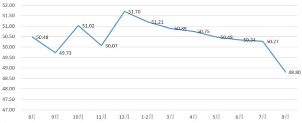 分項指數(shù)中,銷量指數(shù)為51.13,比7月的50.34上升0.79個百分點;平均售價指數(shù)為51.13,比7月的51.09上升0.04個百分點;盈利指數(shù)為51.13,比7月的50.20上升0.93個百分點;綜合成本費用指數(shù)為48.80,比7月的50.14下降1.34個百分點;庫存指數(shù)為48.80,比7月的50.27下降1.47個百分點;電商銷售指數(shù)為50.80,比7月的50.95下降0.15個百分點。