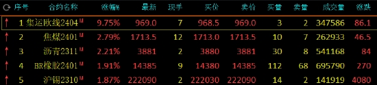 午盤收盤,國內(nèi)期貨主力合約漲跌不一,集運指數(shù)(歐線)漲超9%,瀝青(3910, 31.00, 0.80%)、焦煤(1709, -3.00, -0.18%)漲超2%,丁二烯橡膠(14215, 55.00, 0.39%)(BR)、滬錫(222230, 1240.00, 0.56%)、液化石油氣(LPG)漲超1%。跌幅方面,滬鉛(16745, 200.00, 1.21%)跌超2%,玻璃(1763, 0.00, 0.00%)、橡膠、棕櫚(7770, 30.00, 0.39%)油、工業(yè)硅、20號膠、滬銀、滬鋁(19045, 55.00, 0.29%)跌超1%。