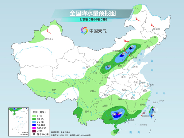 后天,甘肅東北部、陜西北部、內(nèi)蒙古東南部、山西中北部、河北北部和西部、北京大部、廣東大部、廣西大部、湖南南部、臺灣島等地部分地區(qū)有中到大雨,其中,山西東北部、河北北部、廣西東部、廣東西北部、臺灣島東部等地部分地區(qū)有暴雨到大暴雨(100~135毫米)。