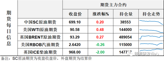 【1】WTI主力原油期貨收漲0.43美元,漲幅0.48%,報(bào)90.58美元/桶;布倫特主力原油期貨收漲0.25美元,漲幅0.27%,報(bào)93.29美元/桶;INE原油期貨收漲0.2%,報(bào)699.1元。