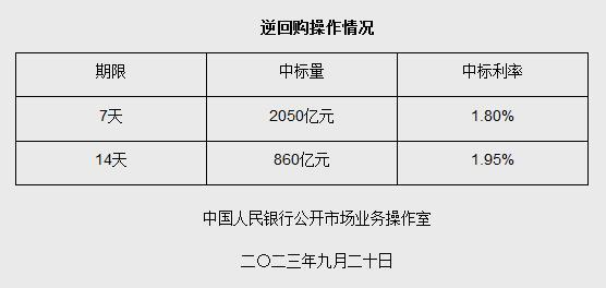 據(jù)央行網(wǎng)站消息,為維護(hù)季末流動(dòng)性平穩(wěn),2023年9月20日人民銀行以利率招標(biāo)方式開(kāi)展了2910億元7天期和14天期逆回購(gòu)操作。具體情況如下: