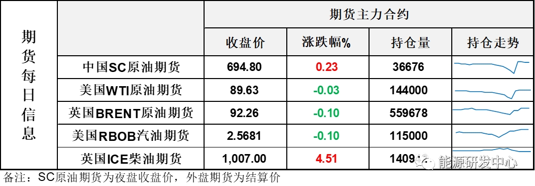 【1】WTI主力原油期貨收跌0.03美元,跌幅0.03%,報89.63美元/桶;布倫特主力原油期貨收跌0.09美元,跌幅0.1%,報92.26美元/桶;INE原油期貨收漲0.23%,報694.8元。