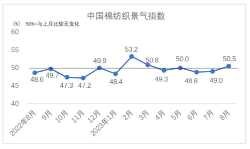 說明:中國(guó)棉紡織行業(yè)景氣指數(shù)采集自全國(guó)近500家次棉紡織廠,參考國(guó)家制造業(yè)PMI等指數(shù)制定方式,通過對(duì)多個(gè)主要指標(biāo)加權(quán)計(jì)算得出,當(dāng)指數(shù)高于50,表示棉紡織行業(yè)本月景氣程度好于上月,低于50則表示本月景氣程度不及上月。