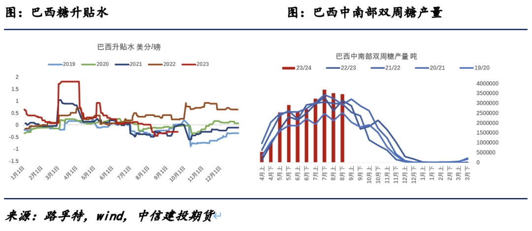 天氣情況利于巴西的甘蔗壓榨,雙周產(chǎn)量持續(xù)創(chuàng)下新高,含水乙醇貼水原糖超10美分/磅,雙周制糖比也持續(xù)在50%以上的水平,現(xiàn)貨的壓力持續(xù),賣(mài)壓也導(dǎo)致升貼水價(jià)格處于同期低位水平。