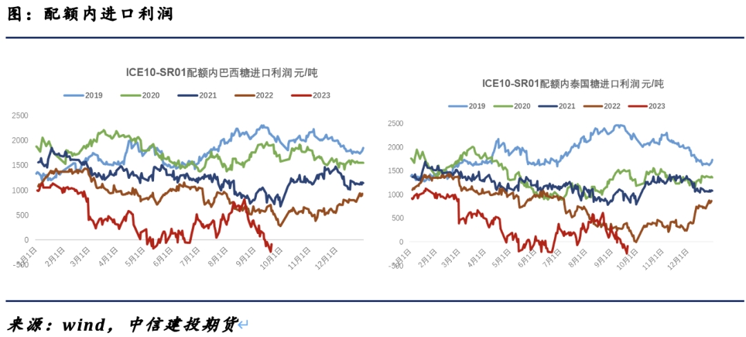 但是需要注意的是,在這一輪因?yàn)閽亙?chǔ)備引發(fā)的大幅下跌后,鄭糖主力和05合約均已經(jīng)跌下配額內(nèi)的進(jìn)口成本6900元/噸的水平,配額外的進(jìn)口成本已經(jīng)倒掛接近2000元/噸的歷史極值水平;盡管我們常常說(shuō),在當(dāng)前糖源結(jié)構(gòu)復(fù)雜、成本差異化的背景下,長(zhǎng)期用配額外的進(jìn)口成本做為鄭糖上方的錨定不理智,但是價(jià)格低至配額內(nèi)的進(jìn)口成本的確不合理,因此前期多單可繼續(xù)持有,但在拋儲(chǔ)階段不易高位追多。