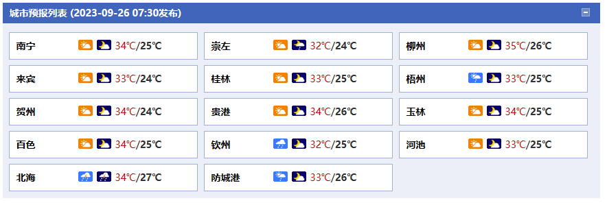 南寧市:今天白天到晚上,多云、局地有陣雨或雷雨,偏東風1~2級,最高氣溫34℃,最低氣溫25℃。