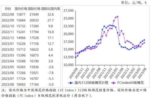 (三)內(nèi)外棉價(jià)差縮小。CotlookA指數(shù)(相當(dāng)于國內(nèi)3128B級(jí)棉花)折合人民幣每噸15084元,比中國棉花價(jià)格指數(shù)(CCIndex)3128B級(jí)每噸低2999元,價(jià)差比上月擴(kuò)大10元。進(jìn)口棉價(jià)格指數(shù)(FCIndex)M級(jí)(相當(dāng)于國內(nèi)3128B級(jí)棉花)月均價(jià)每磅97.09美分,1%關(guān)稅下折到岸稅后價(jià)每噸17046元,比國內(nèi)價(jià)格低1037元,價(jià)差比上月縮小42元;滑準(zhǔn)稅下折到岸稅后價(jià)每噸17184元,比國內(nèi)價(jià)格低899元,價(jià)差比上月縮小38元。