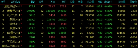 2023年9月26日,國內(nèi)期市收盤,國內(nèi)期貨主力合約大面積飄綠。集運(yùn)指數(shù)(歐線)期貨跌超9%,盤中一度觸及跌停;碳酸鋰跌超5%,液化石油氣(LPG)、焦炭(2383, -41.00, -1.69%)跌超4%,丁二烯橡膠(13845, -135.00, -0.97%)(BR)、焦煤(1777, -14.00, -0.78%)、燒堿、苯乙烯(EB)跌超3%,對二甲苯(PX)、20號(hào)膠(NR)、橡膠跌超2%;漲幅方面,紙漿漲超1%。