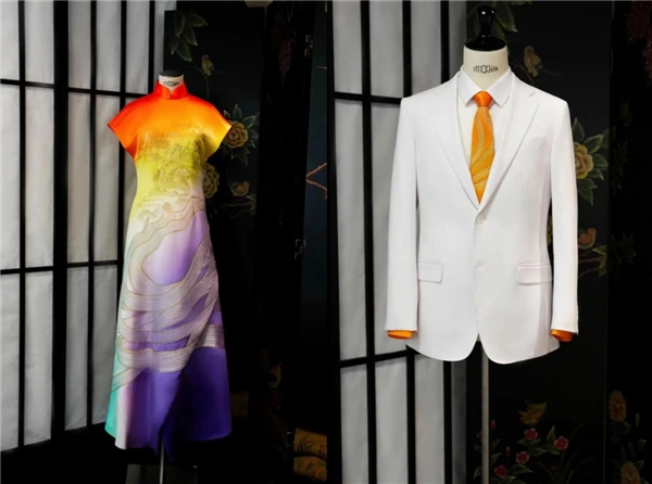如何把這一宏偉的構(gòu)思落地生產(chǎn)為精美禮服?博亞服飾在面料運(yùn)用、量體、剪裁等各個(gè)環(huán)節(jié)都下足功夫,層層淬煉、精心打磨?!岸Y服面料是以專項(xiàng)專定的真絲與人絲交織的紗線形成吸濕、透氣、舒適等功能,以高科技術(shù)精美織造提花形成華貴美麗圖案,以傳統(tǒng)手繪工藝的獨(dú)特性凸顯色彩與水的浸染、暈染、渲染等相互映襯、相互融合,以激光投影配合下的智能化立體裁剪輔助,從而達(dá)到獨(dú)具特色的服飾藝術(shù)效果。”博亞服飾創(chuàng)始人李雅建說(shuō)。