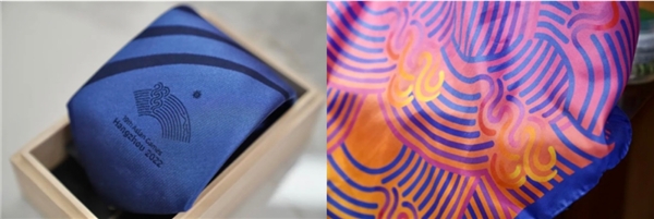 其中,男裝配以藍(lán)色領(lǐng)帶,領(lǐng)帶上面印制了杭州亞運(yùn)會(huì)會(huì)徽——潮涌,搭配了流暢的深色網(wǎng)紋線條,精美而又別致,讓人眼前一亮;女裝為西裝半裙,領(lǐng)口佩戴色彩明亮的絲巾,絲巾顏色從深藍(lán)漸變?yōu)榧t色,并且融入了杭州亞運(yùn)會(huì)元素,整套服裝給人以端莊大方又不失靈動(dòng)的感覺,彰顯出了杭州亞運(yùn)會(huì)精神。